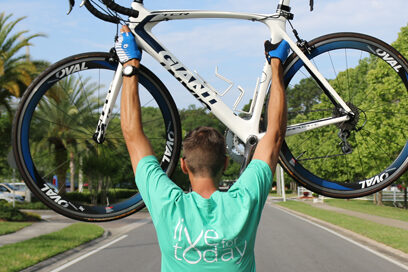 Nathan had treatment the same day the Keys to Keys team arrived in Jacksonville. After he finished treatment, we had Nathan meet the riders and share his story. As he finished speaking, we prepared for the big surprise of the evening – Nathan’s brand new road bicycle!